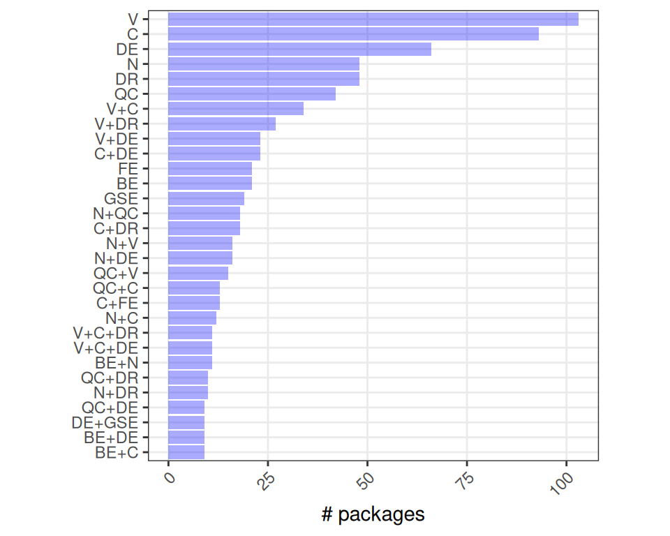 Note that packages can list an arbitary number of terms so that packages can be counted in more than one category; e.g., “Visualization” appears in most.