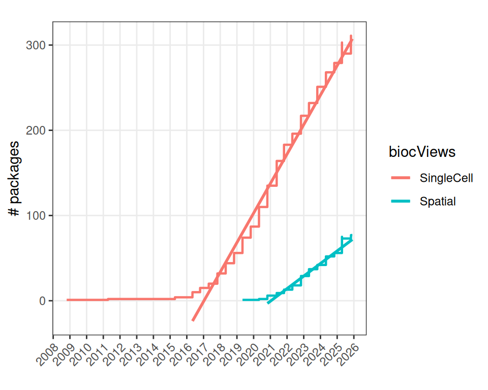 Let’s first summarize the number of packages available over time, focusing specifically on “SingleCell” and “Spatial” packages.