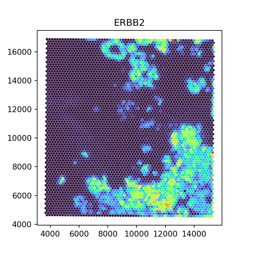 Now that we have converted the SpatialExperiment object to AnnData format, we can run Python code per usual (e.g., continue analysis using squidpy). As a proof of concept, we here visualize an exemplary gene’s counts spatially:
