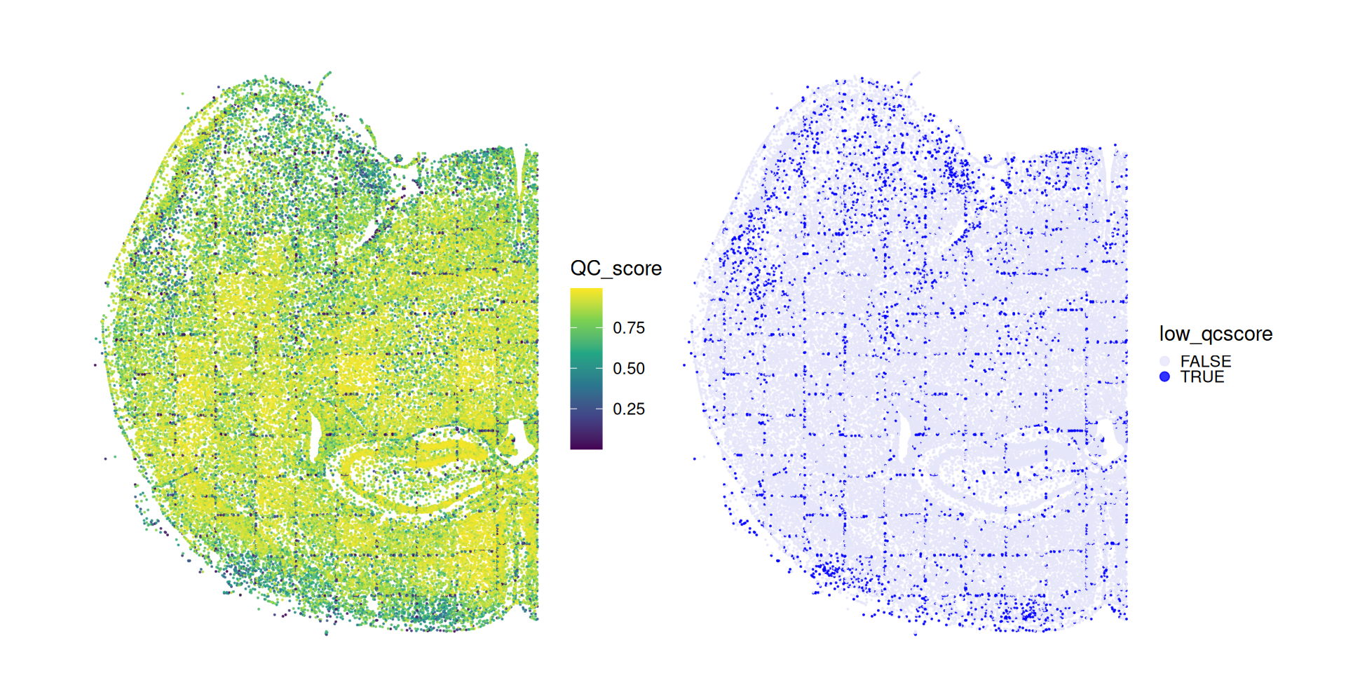 In a stringent analysis, we may want to remove low-quality cells, but this has to be done with caution: before excluding any cells, it is recommendable to inspect where these fall in the tissue. We would expect low-quality cells to be distributed randomly, and otherwise to accumulate at the tissue borders or in regions were tissue was, for example, smudged, detached, necrotic etc.