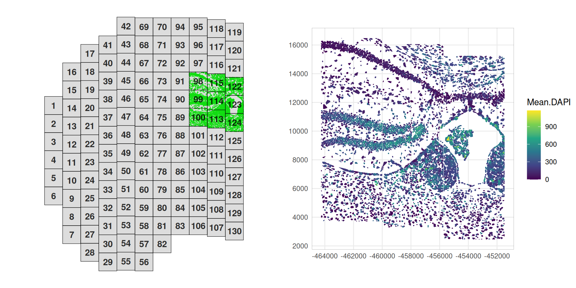 In general, spatially organized clusters of excluded cells might indicate a bias towards exclude specific types of cells (e.g., some immune cells tend to be smaller or might otherwise contain fewer contains due to the panel design). Whenever possible, we advice readers to cross-check visualizations like the following with a corresponding H&E stain of the tissue, considering possible experimental faults as well as their prior knowledge on tissue pathology.
