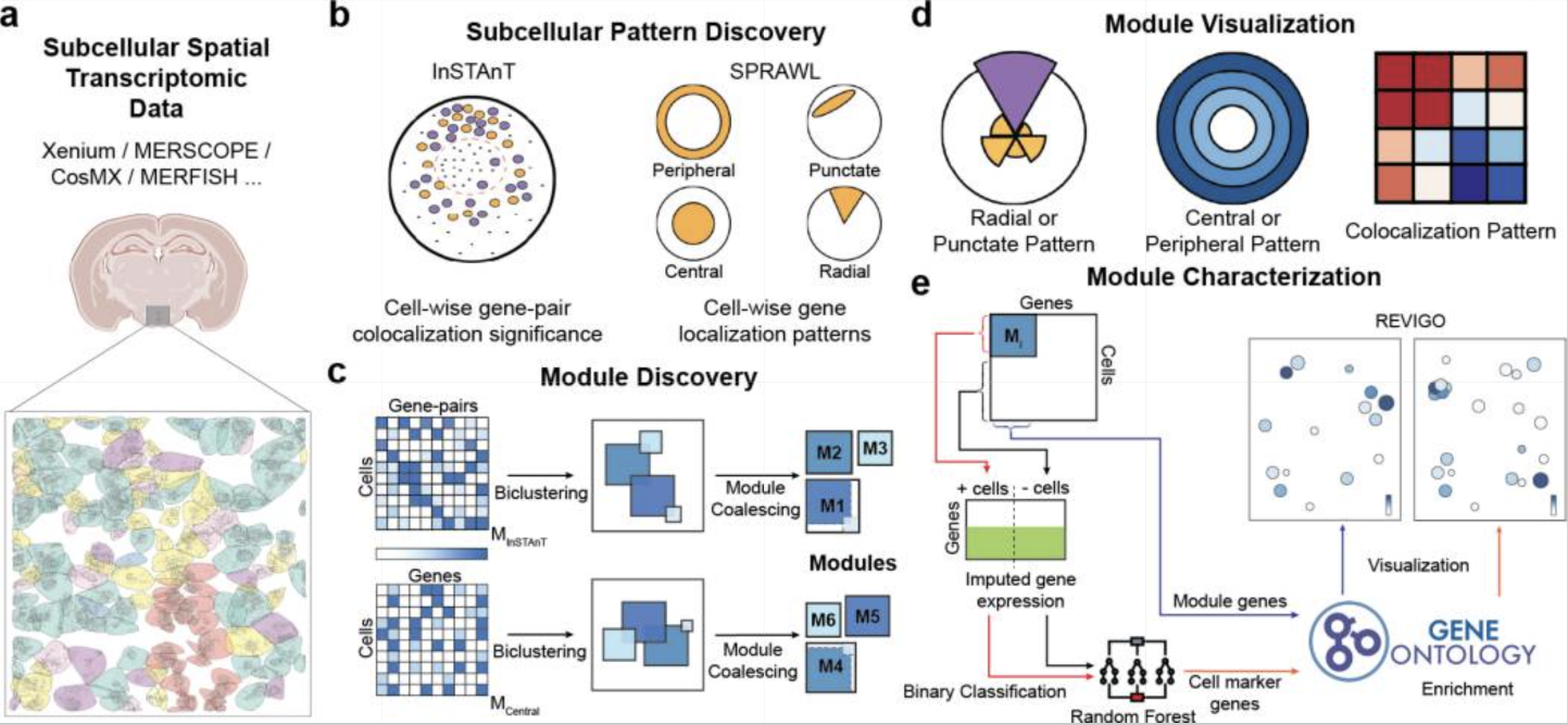 CellSP (Aggarwal and Sinha 2025) is a Python-based workflow for identifying sub-cellular patterns of transcripts that can be further used to identify and characterize gene-cell modules. It provides tools for visualizing the gene-cell modules and examining their functional significance.