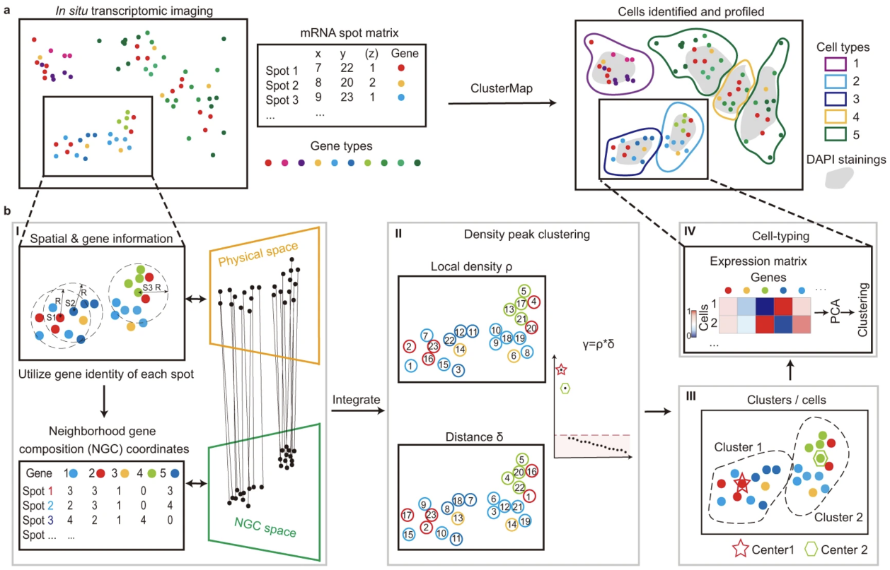 ClusterMap (He et al. 2021) is a Python-based method capable of segmentation-free spatial clustering of transcripts to multiple scales, thereby identifying sub-cellular domains that might represent sub-cellular structures or cell bodies or cell-level clusters representing cell types and domains. It can also perform cell segmentation and sub-cellular compartmentalization using just transcript locations. Depending on the radius used to measure neighborhood size around a transcript, it can identify clusters at sub-cellular (sub-cellular domains/compartments), cell (cell types), or tissue (domain) level, and perform sub-cellular or cell segmentation.