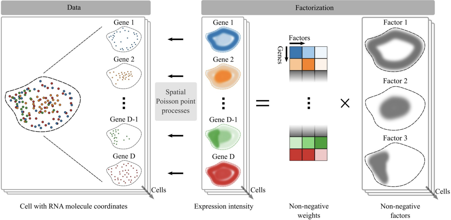FISHFactor (Walter, Stegle, and Velten 2023) is another Python-based method for sub-cellular data analysis. It uses spatial Poisson point processes to model location of each transcript within each cell and spatially-aware Gaussian processes to identify sub-cellular localisation patterns.