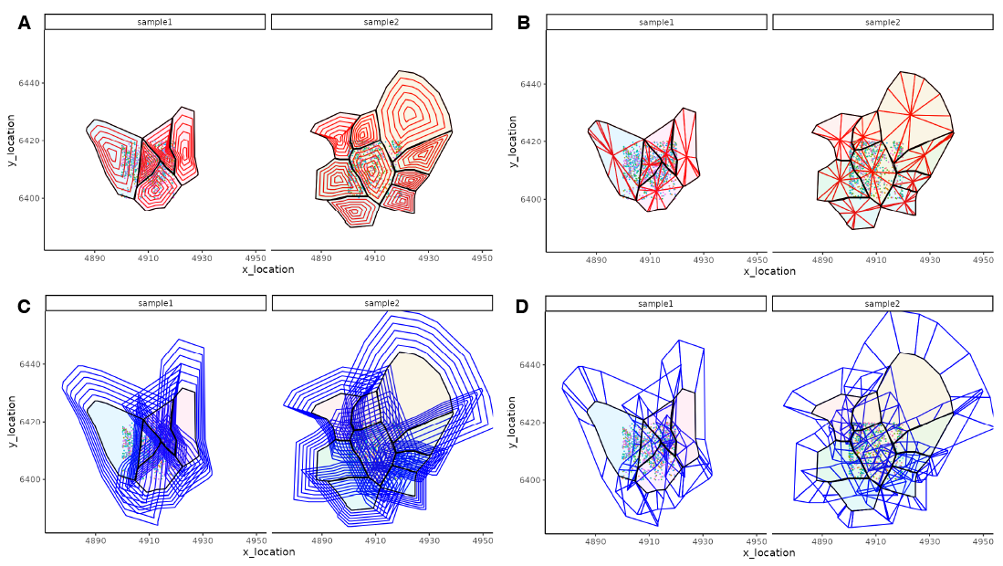 A majority of the molecule-resolved SRT data are 2D projections of 3D structures, such as cells, organelles, or even processes like RNA transport. A few imaging-based SRT technologies are capable of measuring tissue depth as z-axis, generating 3D coordinates with a sparse z-axis. However, working with 2D vs 3D data is not so different, since spatial relations are often captured as neighborhoods defined by Euclidean or other distance measures between locations, irrespective of coordinate dimension. Therefore, many tools are able to use n-dimension coordinates for measuring spatial relationships. For example, ClusterMap can use 3D coordinates by using z_radius for z-axis data, if its available, whereas for 2D coordinates it sets z_radius = 0 (He et al. 2021).
