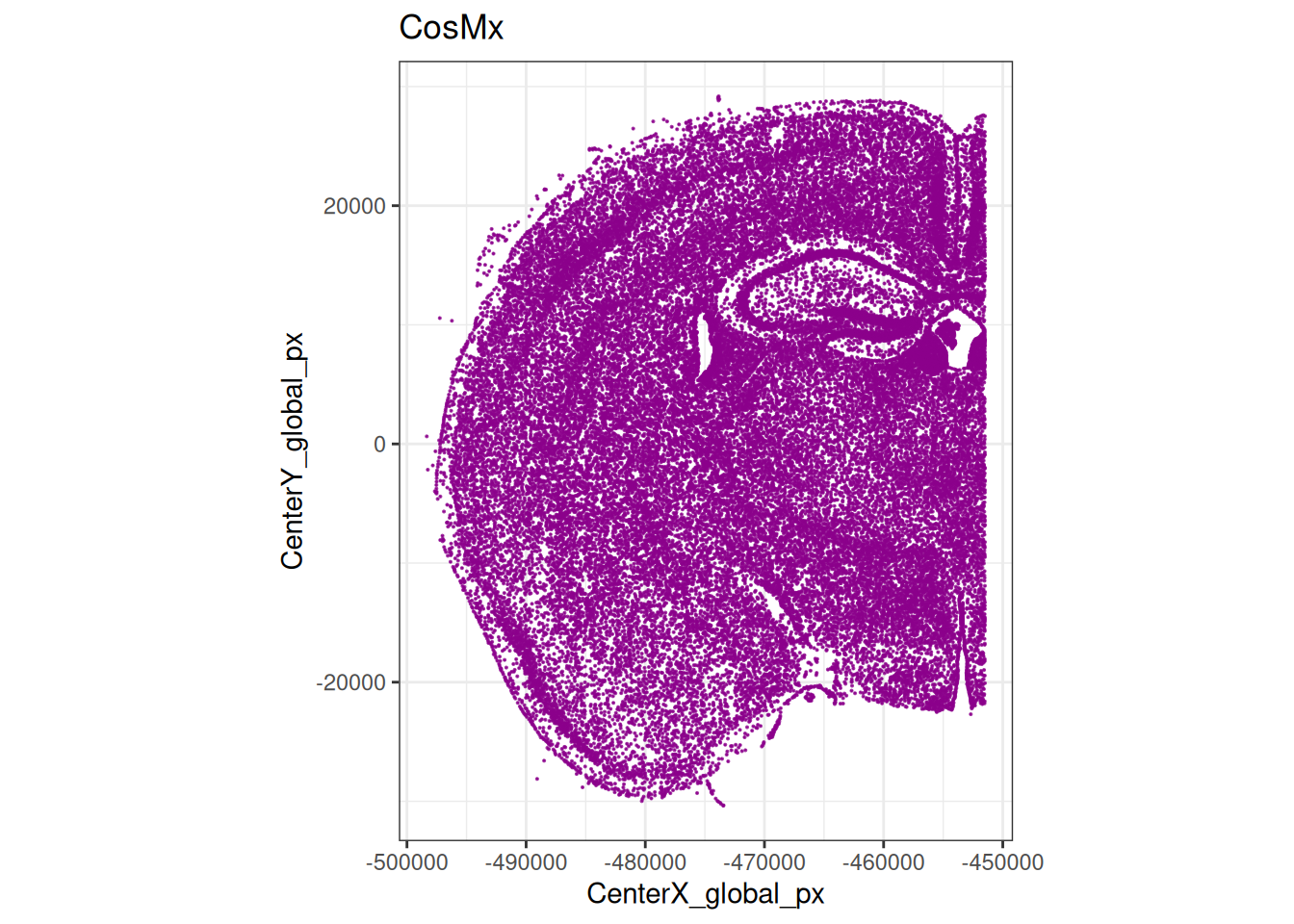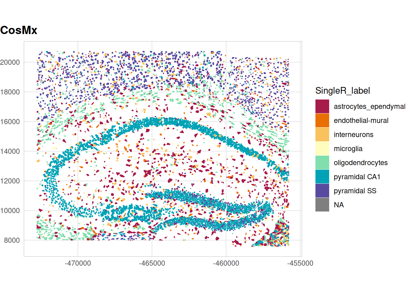 In this demo, we will analyze a 1k-plex CosMx data (Bruker) of a mouse brain sample; see Chapter 6. Following quality control and preprocessing, we will perform cell type annotation, identification of marker genes, and cell-cell interaction analysis.