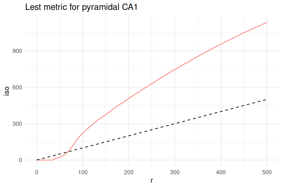 In this type of plots, the dashed line represents the theoretical value of the metric under complete spatial randomness (CSR). Values above this line indicate clustering, while values below indicate dispersion. Here, we can see that pyramidal CA1 neurons tend to cluster together, as expected.