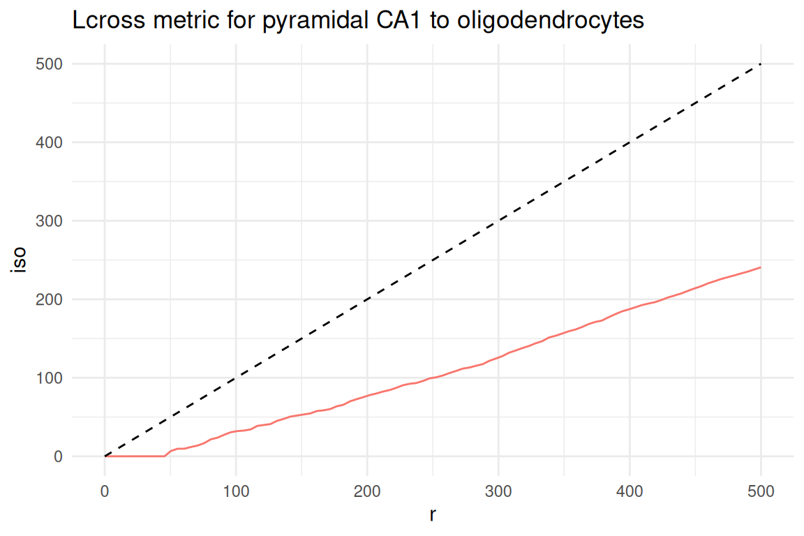 In this case, we can see that pyramidal CA1 neurons and oligodendrocytes tend to be spatially segregated, as indicated by the cross-L function being below the CSR line.