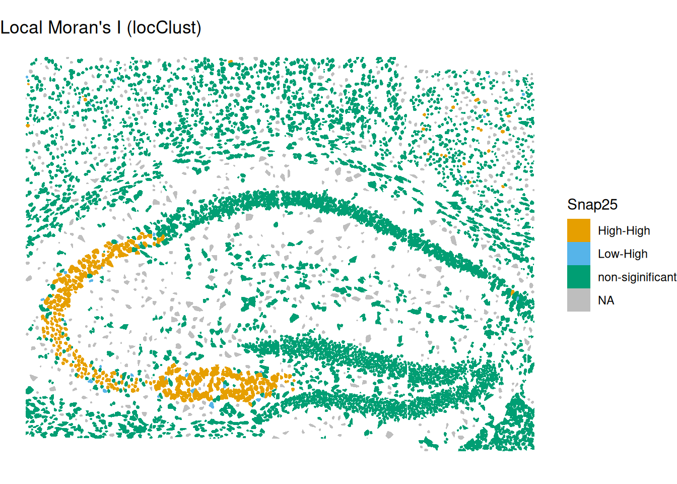 In this case, we can see a significant positive autocorrelation in the lower left part of the structure, while the rest of the tissue does not show significant autocorrelation.