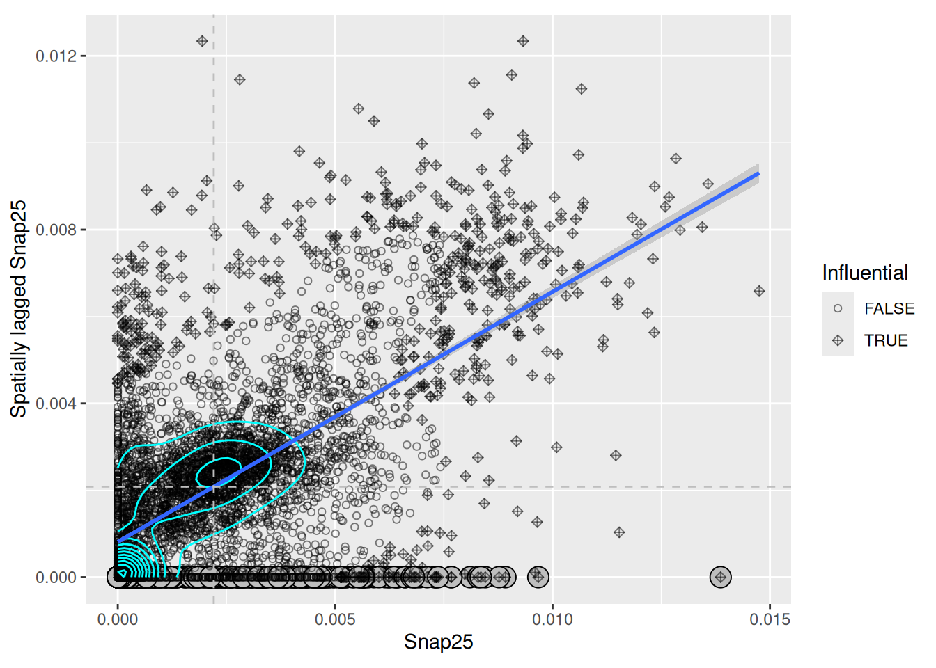 We focus on Snap25 and visualize its autocorrelation structure using a Moran scatter plot, which shows the relationship between the expression of the gene in each cell and the average expression in its neighbors.