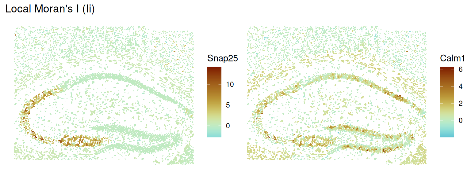 Here, we focus on Snap25 and Calm1, neuronal marker genes identified above that show interesting spatial expression distributions (see above). First, we compute the local Moran’s I coefficient.