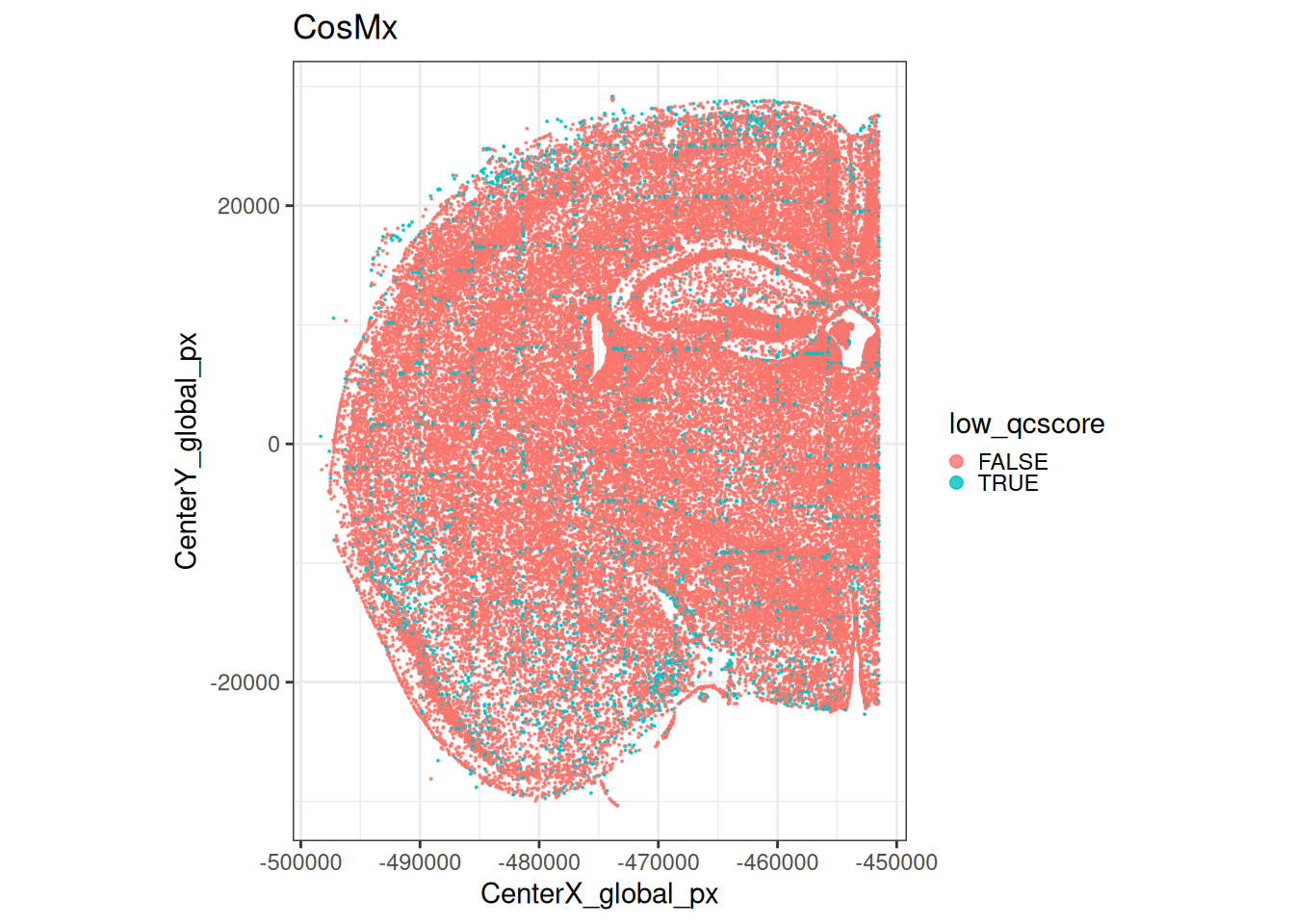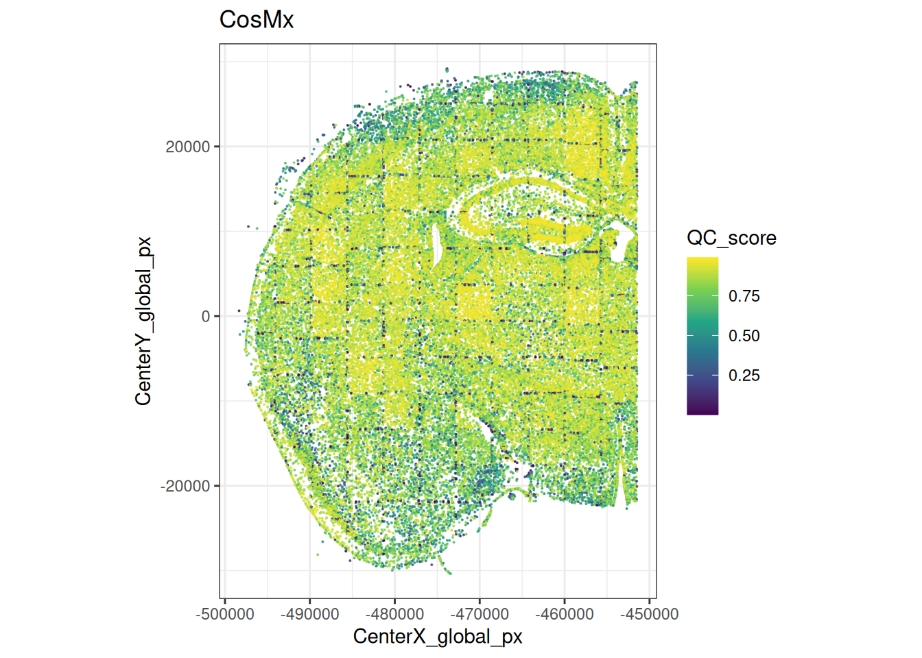 Chapter 19 gives a thorough overview of quality control steps for imaging-based spatial transcriptomics data, including CosMX-specific metrics. Here, we will simply compute SpaceTrooper’s aggregated QC score and keep the cells that pass the threshold.