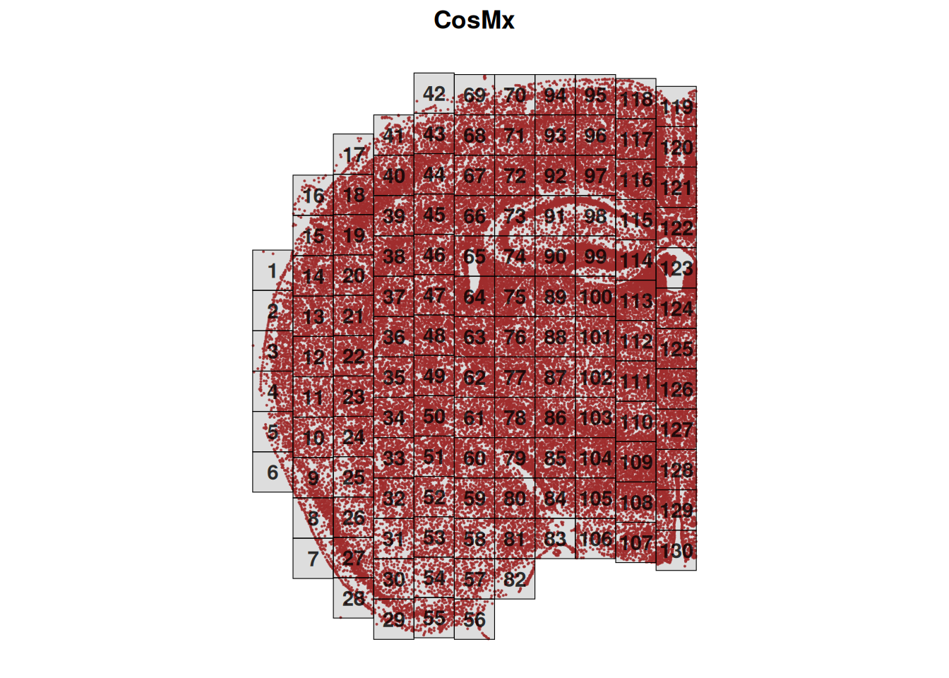 Unlike, Xenium and MERSCOPE, CosMx does not stitch fields of view (FOVs) in a single image, but rather treats each FOV independently. It is therefore useful to visualize a map of the FOVs to understand their spatial arrangement.