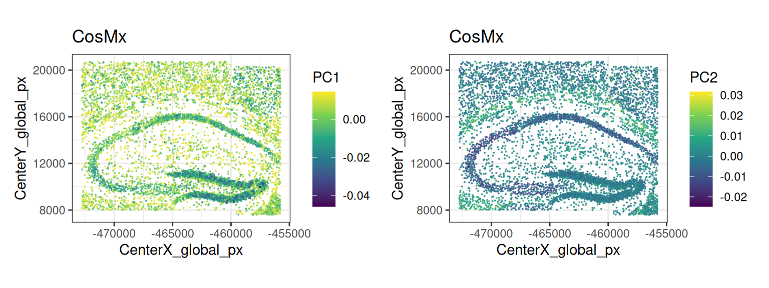 From the plots, we can see that Snap25 shows positive spatial autocorrelation in a very localized part of the tissue, while Calm1 shows a more diffuse autocorrelation structure.
