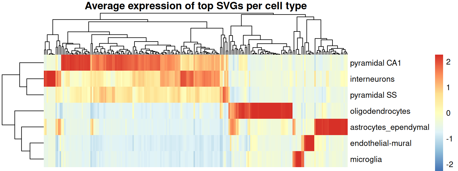 df<-res$gene_resultsgs<-df$gene_id[rank(df$PValue, ties.method="min")==1]mu<-t(apply(counts(sub)[gs, ], 1, tapply, sub$SingleR_label, mean))pheatmap(t(mu), scale="column", show_colnames=FALSE, cluster_rows=TRUE, cluster_cols=TRUE, main="Average expression of top SVGs per cell type")