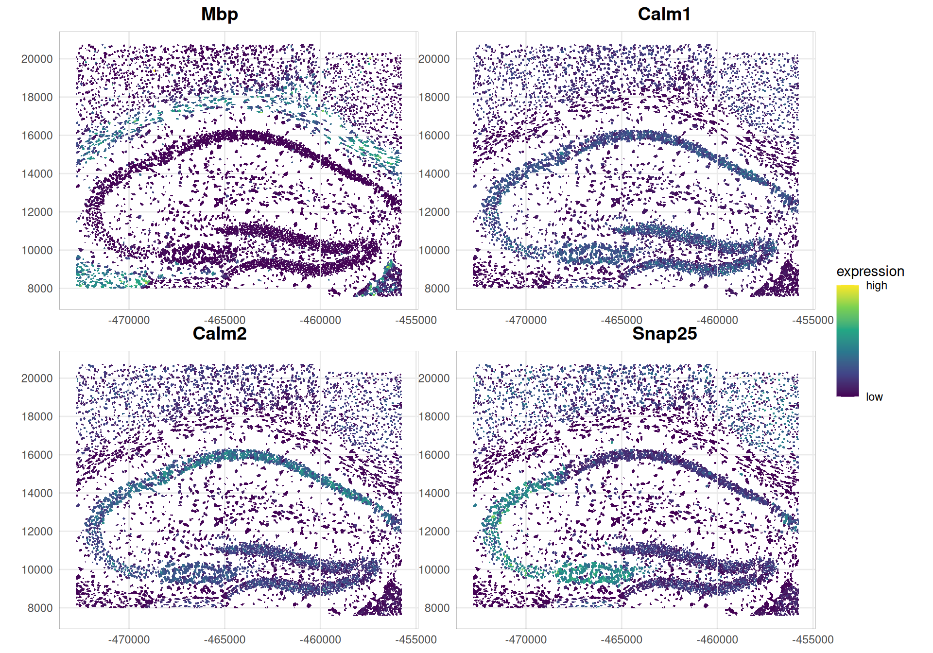 We can also visualize the spatial distribution of some of these genes, e.g., Mbp that marks oligodendrocytes, and Calm1, Calm2, and Snap25 that mark different subsets of neurons. Note also how some genes show a difference of expression within the pyramidal neuron population, suggesting the presence of subtypes.