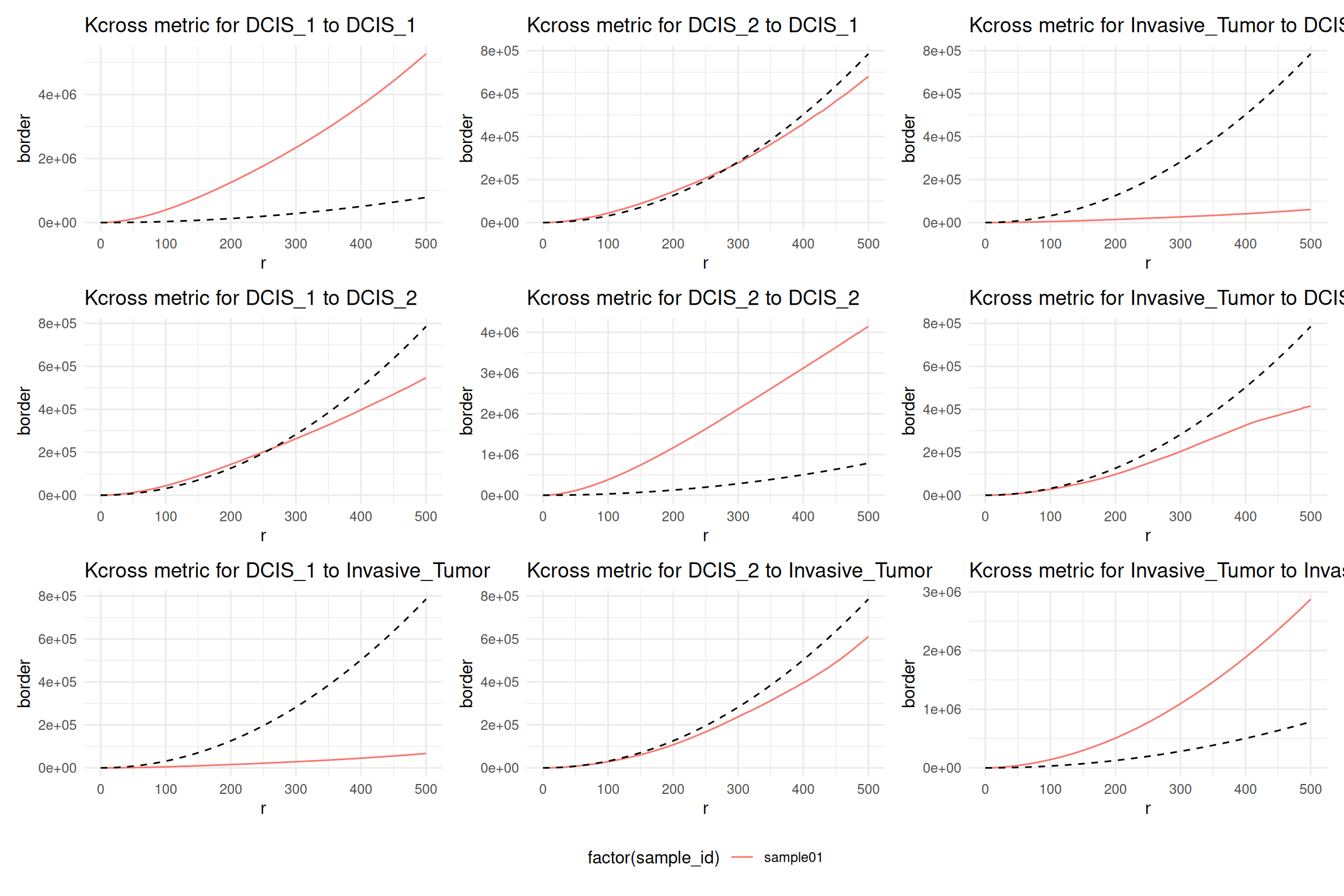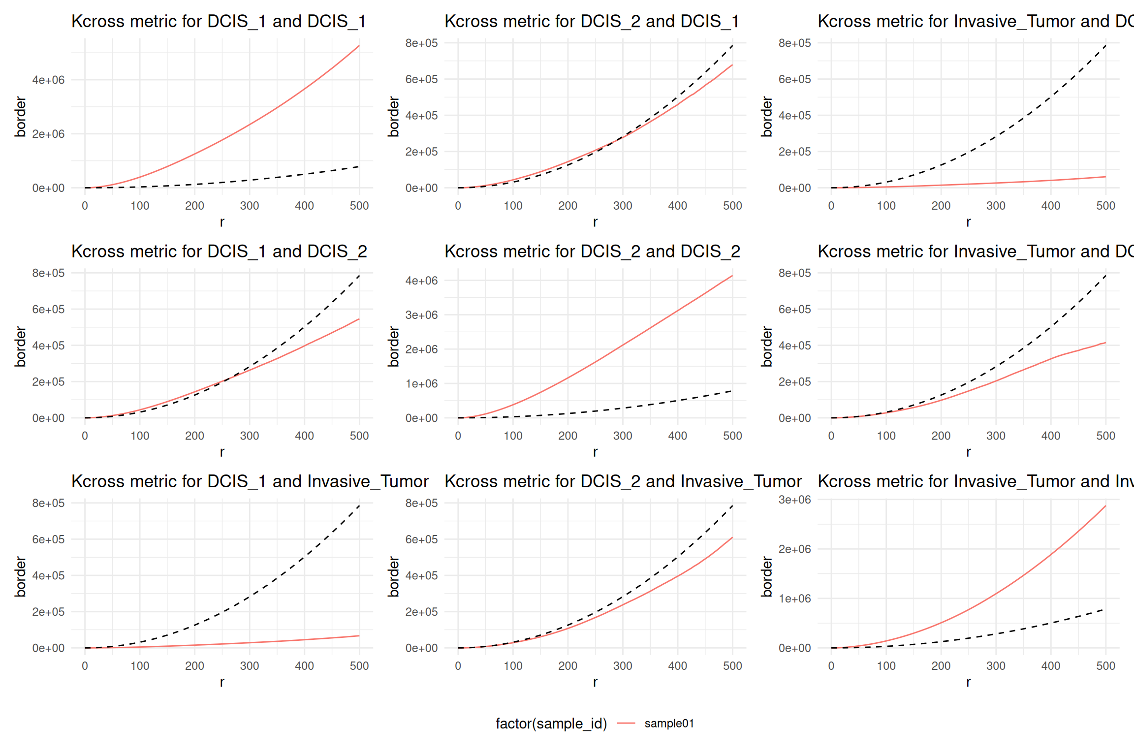 We note that all cell types, ductal carcinoma in situ 1 (DCIS 1), ductal carcinoma in situ 2 (DCIS 2), and invasive tumor cells show a clear interaction among themselves. DCIS 1 and invasive tumor cells show spacing, meaning there are fewer invasive tumor cells found in DCIS 1 than expect under complete spatial randomness (CSR). However, DCIS 2 and invasive tumor cells show a distribution that is completely spatially random in a \(500 µm\)\(r\)-neighborhood.