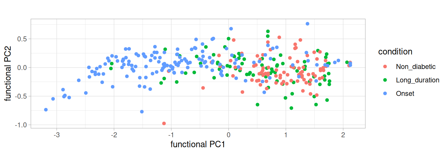From the FPCA, we note that the variability in curves from ‘Onset’ patients is larger than the other two groups.