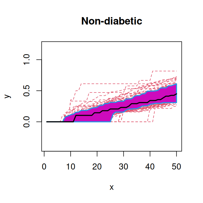 From these plots, we note that the functions from ‘Onset’ patients seem to qualitatively have a higher median curve than those from ‘Non-diabetic’ or ‘Long-duration’ patients.