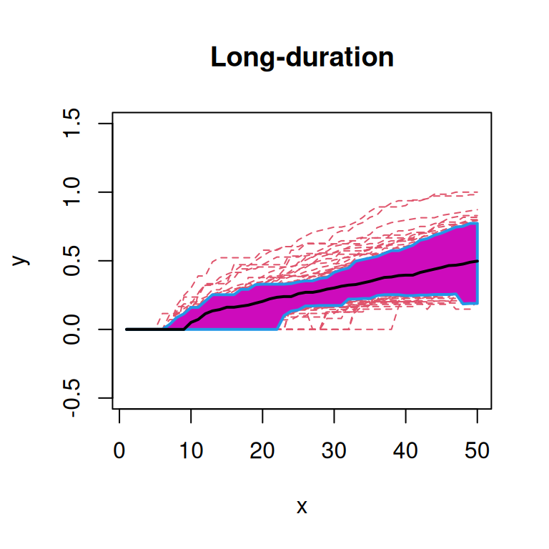 The black line indicates the median curve, the purple region is the 50% central region, and the red lines indicate outliers.