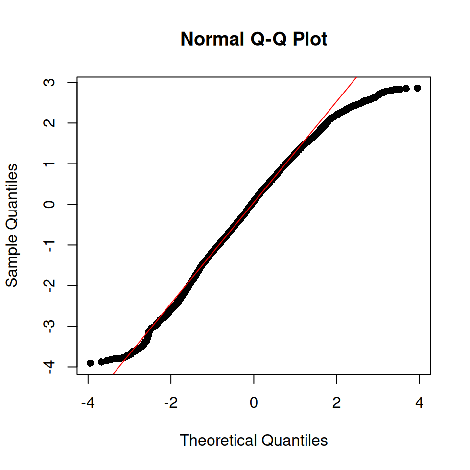 The Q-Q plot indicates a reasonable model fit, although not perfect.