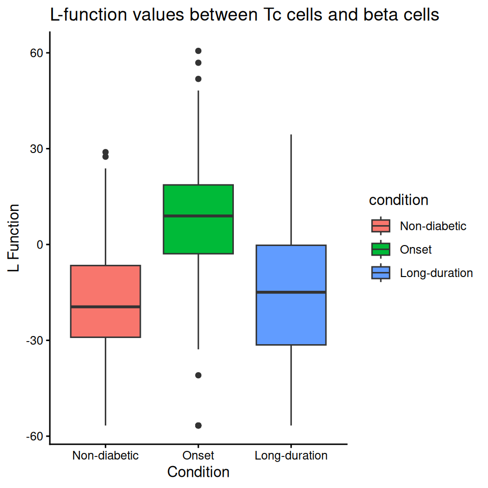 Here, we can observe that the most significant relationship occurs between cytotoxic T cells (Tc) and the beta cells of the pancreas. Tc and beta cells appear to be significantly more co-localized in patients with onset diabetes compared to non-diabetic patients, indicated by the positive coefficient.