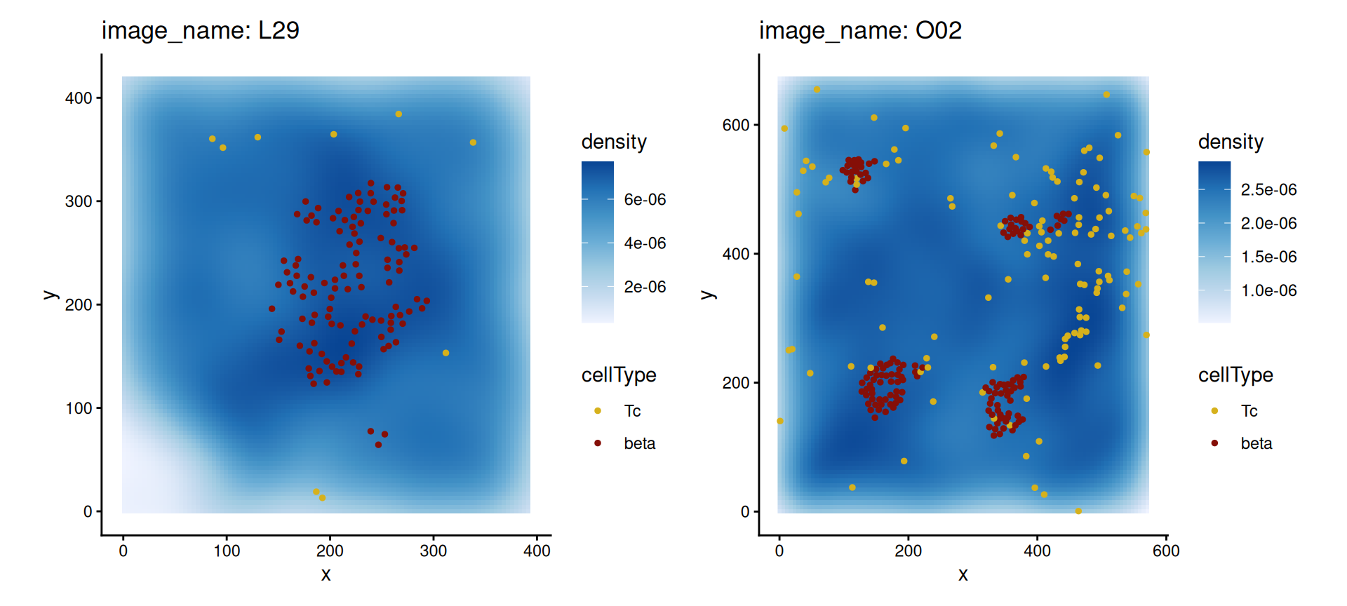 In this section, we will explore tools to assess differential colocalization between conditions with the two packages spicyR and spatialFDA. Both packages are based the comparison of known spatial statistics functions implemented in the package spatstat.