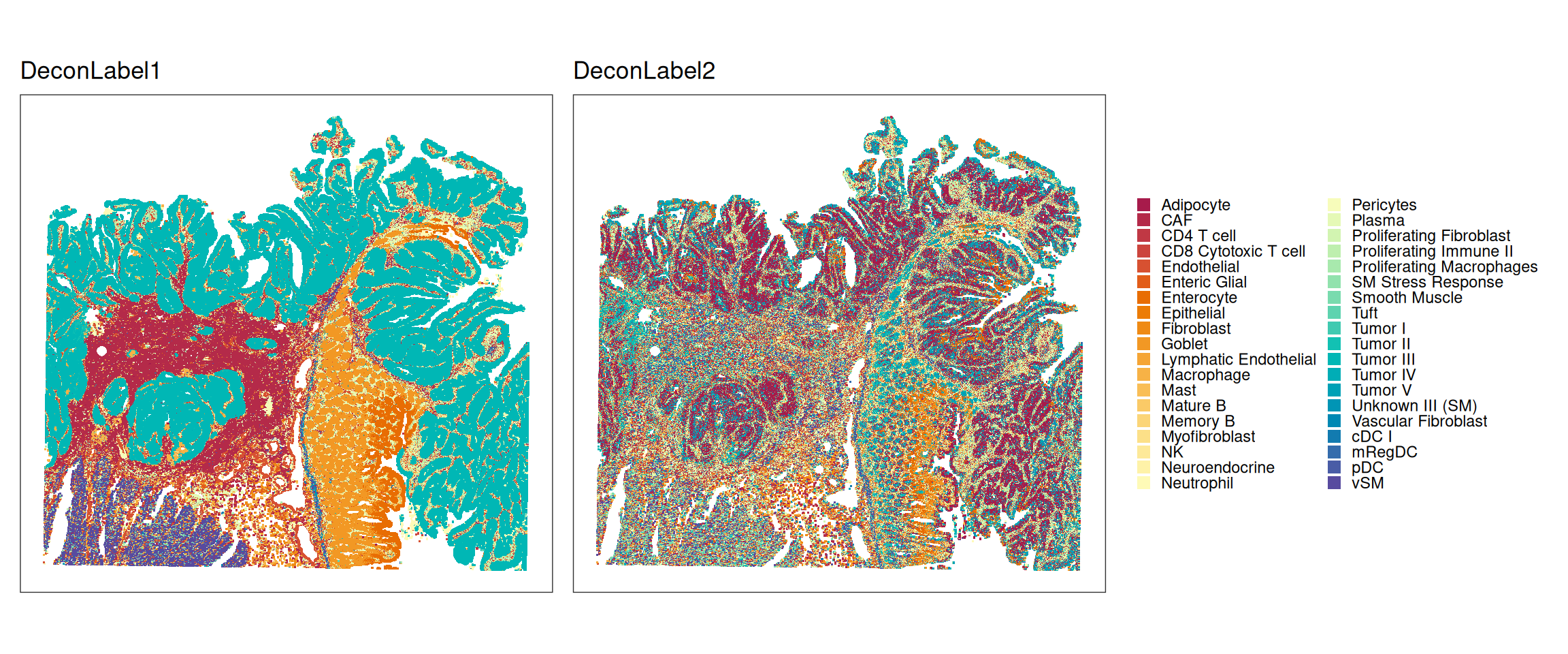 In this demo, we perform deconvolution on 16 µm bins and compare the concordance with results on 8 µm bins, provided by 10x Genomics.