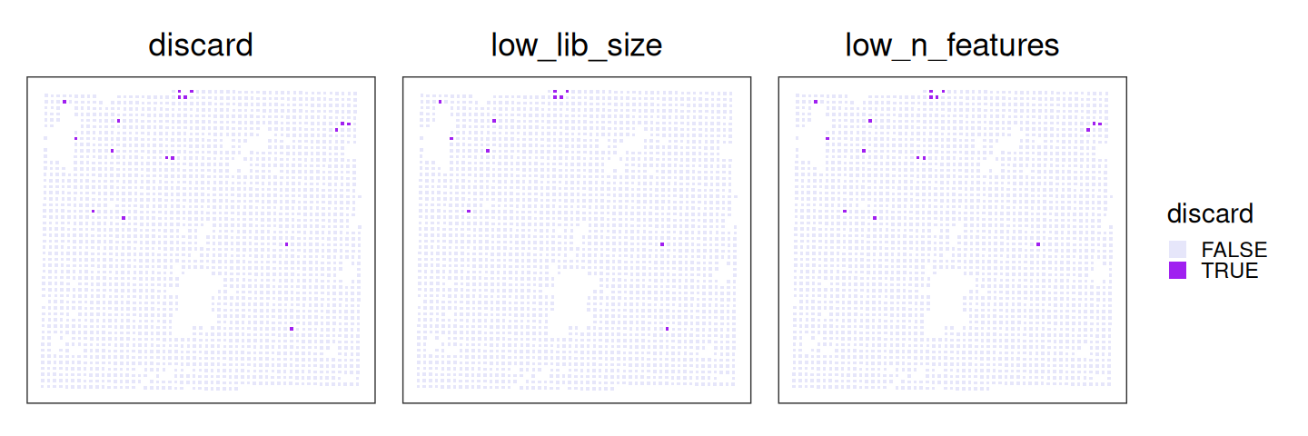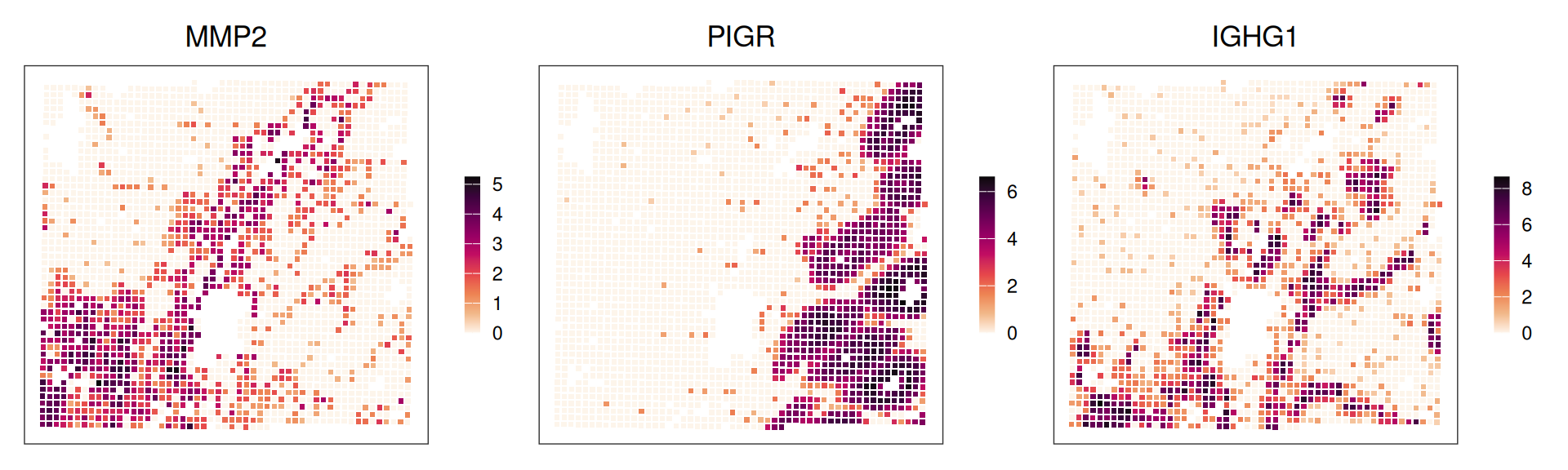 We can visualize such bins by zooming into an empty tissue region. On the left-hand side, one region shows a clear gap with low counts. Informed by H&E staining, bins located above tissue gaps should not be interpreted biologically, as the low counts in these bins are likely due to ambient RNA or transcript spillover. Therefore, they should be excluded from downstream analysis.