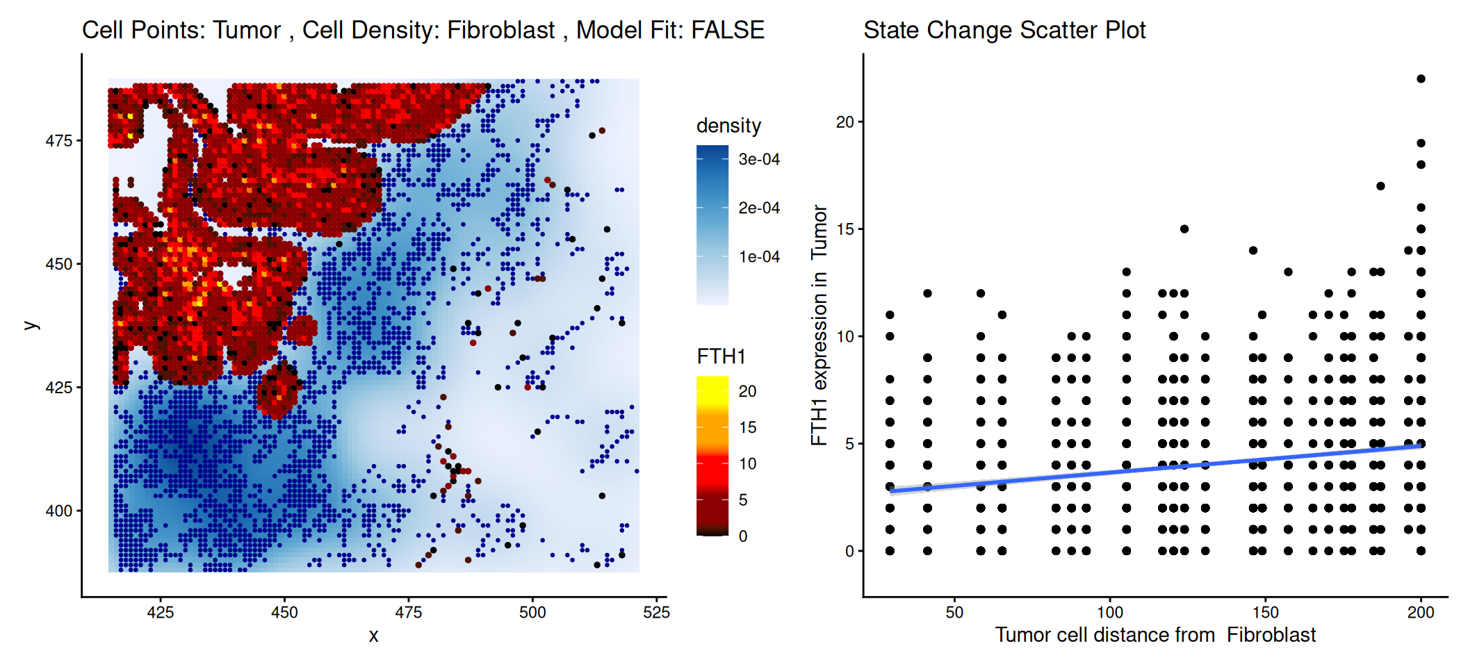 Here, we aim to determine whether the expression level of the tumor marker changes in proximity to fibroblast. Using FTH1 as an example, we observe a decrease in FTH1 expression in tumor bins as the distance to fibroblast increase. This trend could be visualized using a scatter plot.